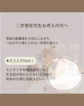 弊社、住まいる不動産の建築部ナチュライフデザインホームでは、家族それぞれの想いに寄り添った"無理なく心地いい"二世帯住宅をご提案します。